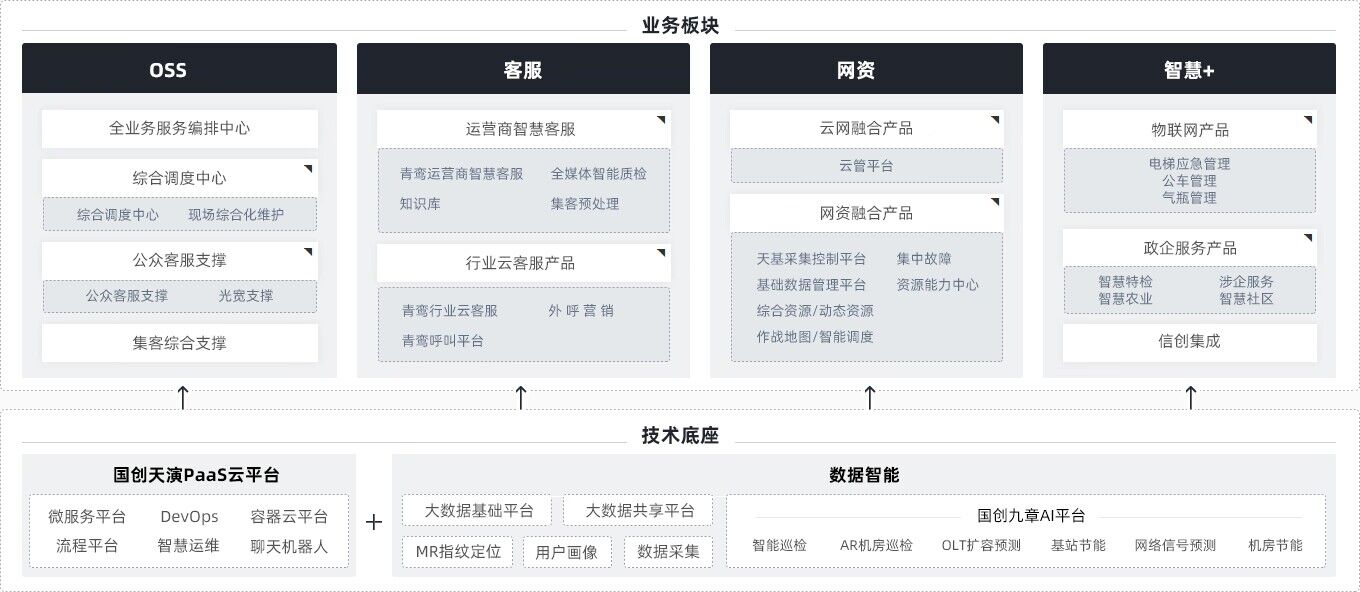 基于國創(chuàng )天演PaaS平臺、國創(chuàng )九章AI平臺、國創(chuàng )高可信HCS平臺提供運營(yíng)支撐、客服和政企數智化應用
